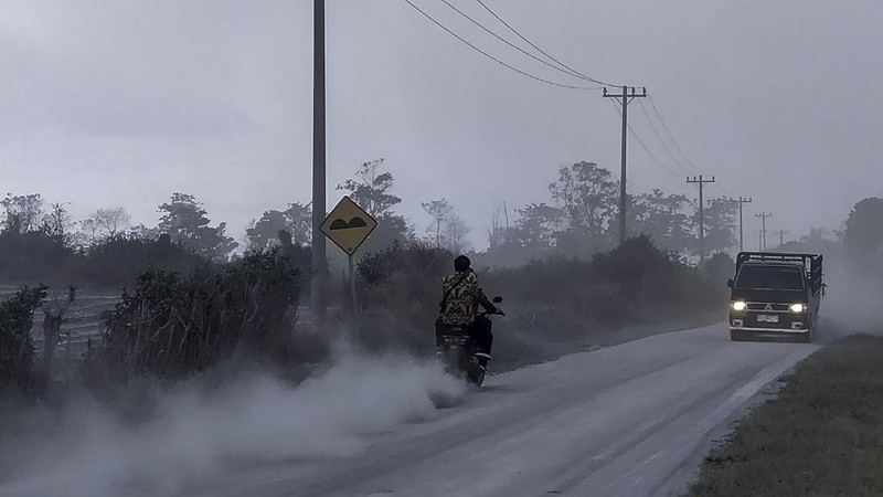 Sejumlah kendaraan melintas di jalan yang dipenuhi debu vulkanik pascaerupsi Gunung Sinabung, di Desa Sigarang-garang, Karo, Sumatera Utara, Sabtu (8/8/2020).