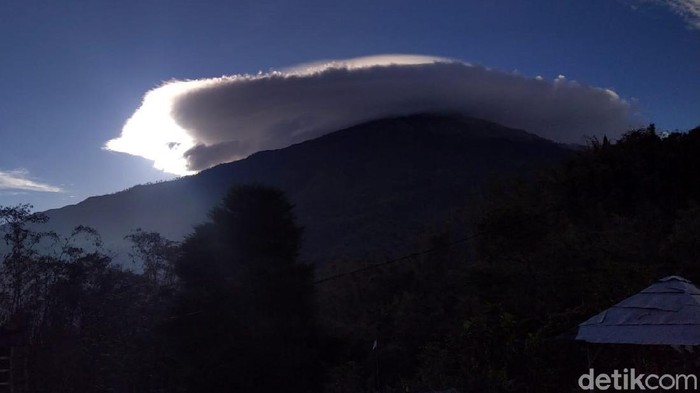 Mojokerto - Warga Mojokerto dibuat takjub oleh keindahan awan lentikularis di atas Gunung Welirang dan Anjasmoro, Kamis (5/11/2020). Gunung tersebut seperti memakai topi.