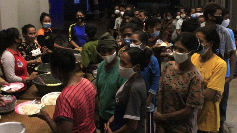 Sejumlah pengungsi korban erupsi gunung berapi Ili Lewotolok mengantre untuk mendapatkan makanan di halaman Kantor Perpustakaan Daerah Kota Lewoleba, Kabupaten Lembata, NTT, Senin (1/12/2020).