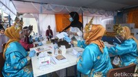 Para petugas di TPS pun menggunakan baju adat dilengkapi masker atau face shield.