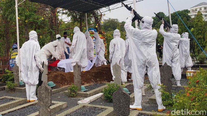 Proses upacara pemakaman dilakukan oleh personel TNI yang memakai pakaian hazmat.