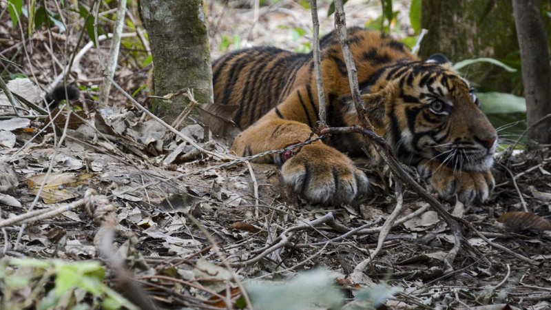Kasihan! Anak Harimau Ini Terjebak Jerat BAGIKAN URL telah disalin Seekor anak Harimau Sumatera (Panthera Tigris Sumatrae) terkena jerat di Desa Gulo, Darul Hasanah, Aceh Tenggara, Aceh, Sabtu (23/1/2021). Tampak kaki depan harimau terluka akibat terkena jerat. Tim gabungan Balai Konservasi Sumber Daya Alam (BKSDA) Aceh memotong kawat sling yang menjerat kaki anak Harimau Sumatera (Panthera Tigris Sumatrae). Mereka kemudian mengevakuasi anak harimau tersebut. Tim gabungan Balai Konservasi Sumber Daya Alam (BKSDA) Aceh memikul anak Harimau Sumatera (Panthera Tigris Sumatrae) yang terkena jerat.