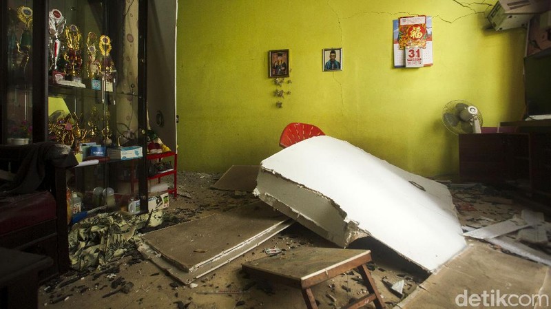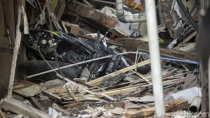 Selain rumah, sebuah motor juga tampak rusak akibat tertimpa bangunan.