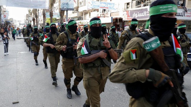 Anggota Brigade Ezzedine al-Qassam melakukan parade militer di Jalur Gaza bagian selatan. AP Photo/Adel Hana.