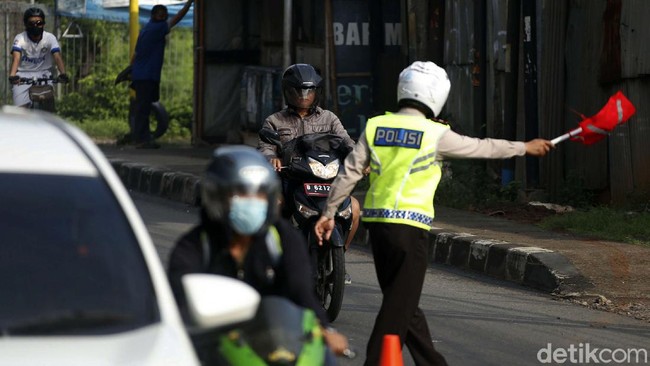 Jakarta - Razia masker digelar di Jalan Kalimalang Raya, Minggu (30/05/2021). Untuk menghindari razia, seorang pemotor yang tidak bermasker hampir menabrak polisi.