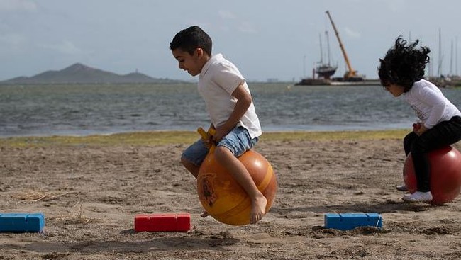 Siswa dari Colegio Felix Rodriguez de la Fuente bermain di pasir pantai Los Nietos di Mar Menor, Cartagena, Spanyol.