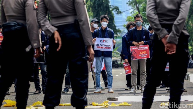 Jakarta - Tes Wawasan Kebangsaan (TWK) pegawai KPK terus mendapat sorotan. Kali ini sejumlah mahasiswa mendatangi gedung KPK mengkritik kebijakan TWK tersebut.