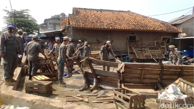 Cianjur - Sebanyak 200 pedagang Pasar Ciranjang Kabupaten Cianjur, Jawa Barat yang membandel dan kembali berjualan di dekat rel Kereta Api ditertibkan petugas.