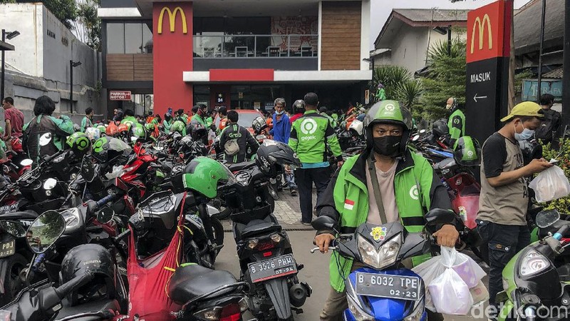 Sejumlah ojek online (ojol) mendatangi McDonald's Raden Saleh, Jakarta, Rabu (9/6/2021). Ramainya antrean membuat terjadinya kerumunan di lokasi ini.