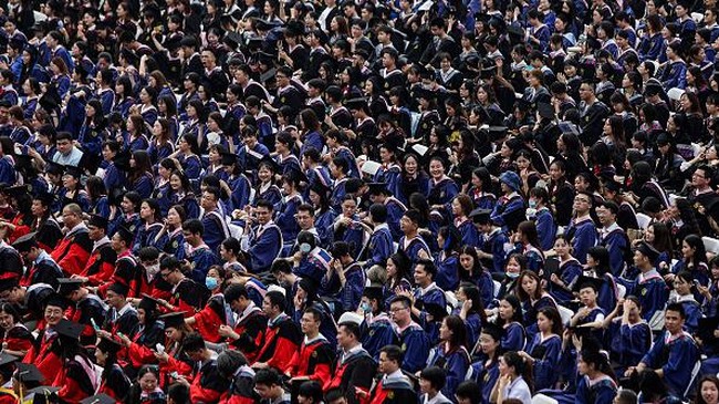 Wuhan - Universitas di Wuhan, China, gelar wisuda yang dihadiri ribuan wisudawan pada akhir pekan lalu. Para wisudawan merayakan kelulusan mereka tanpa gunakan masker.