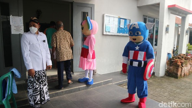 Kudus - Ada pemandangan berbeda saat vaksinasi digelar di Kudus, karena ada Captain America turut mengajak warga untuk vaksin.