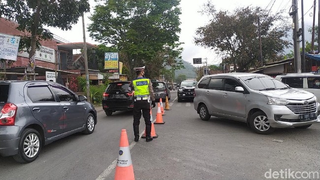 Garut - Petugas gabungan melakukan penyekatan kendaraan wisatawan di perbatasan Garut-Bandung. Puluhan kendaraan terpaksa putar balik.