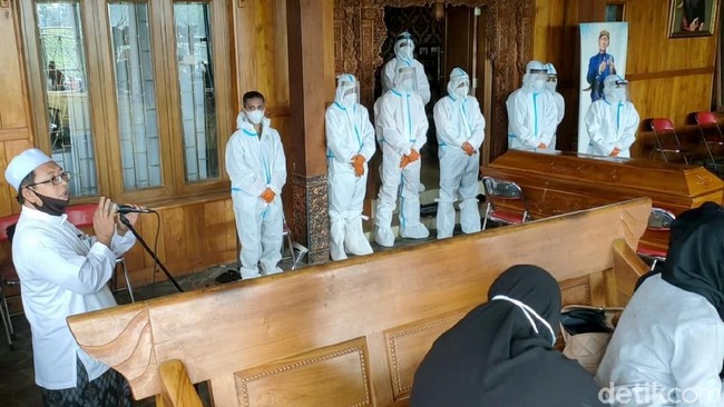Karanganyar - Pemakaman dalang kondang Ki Manteb Sudharsono dilakukan dengan protap COVID-19. Isak tangis keluarga mewarnai pelepasan jenazah ke peristirahatan terakhirnya.