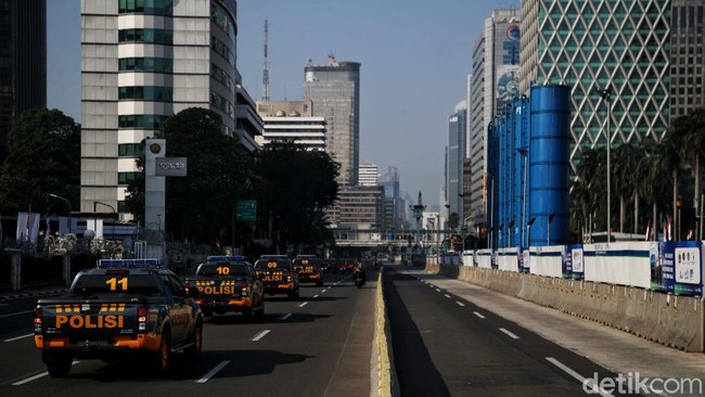 Suasana penyekatan mobilitas PPKM Darurat di kawasan Gambir dan Jalan MH Thamrin - Sudirman, Jakarta Pusat, Sabtu (3/7). Pemberlakuan Pembatasan Kegiatan Masyarakat (PPKM) Darurat Jawa-Bali berlaku sejak Sabtu (3/7/2021). Koordinator PPKM Darurat Jawa-Bali adalah Menteri Koordinator Bidang Maritim dan Investasi (Menko Marves), Luhut Pandjaitan. Pradita Utama/detikcom