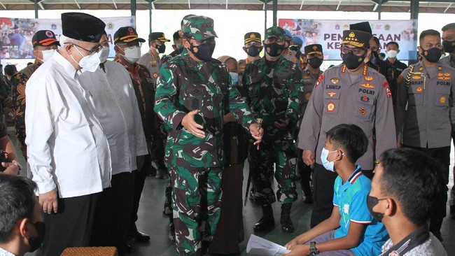 Jakarta - Panglima TNI Marsekal Hadi Tjahjanto bersama Kapolri Jenderal Listyo Sigit Prabowo meninjau pelaksanaan vaksinasi massal.
