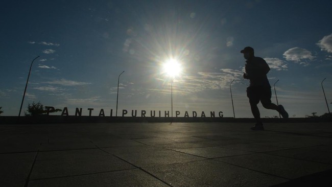 Padang - Warga memanfaatkan kawasan objek wisata Pantai Padang yang ditutup selama penerapan PPKM darurat untuk berolahraga.