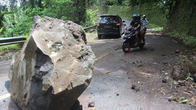 Ternate - Longsor batu besar dari gunung menutup sebagian jalan di Pulau Ternate. Insiden terjadi akibat curah hujan tinggi melanda Kota Ternate sejak Jumat (16/7).