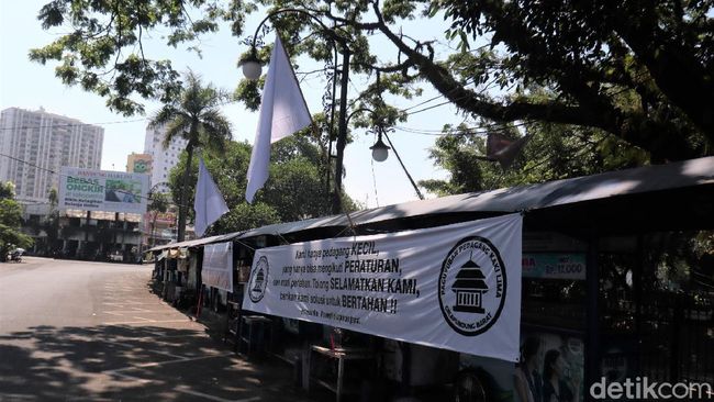 Bandung - Pedagang kaki lima (PKL) di Bandung punya cara sendiri menyuarakan aspirasi mereka tolak PPKM Darurat diperpanjang. Salah satunya dengan kibarkan bendera putih.