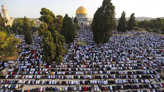 Sejumlah umat Muslim melaksanakan Salat Idul Adha di area sekitar Masjid Dome of the Rock yang berada di kompleks Masjid Al-Aqsa, Yerusalem, Selasa (20/7/2021). AP Photo/Mahmoud Illean
