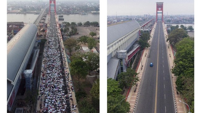 Foto kolase perbandingan suasana Shalat Idul Adha 1442 H di Jembatan Ampera Palembang, Sumatera Selatan, sebelum adanya pandemi COVID-19 (kiri) dan saat pandemi (kanan), Selasa (20/7/2021). ANTARA FOTO/Iggoy El Fitra-Nova Wahyudi