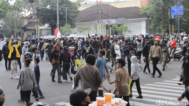 Bandung - Polisi membubarkan massa aksi penolak Pemberlakuan Pembatasan Kegiatan Masyarakat (PPKM) yang menduduki persimpangan Dago-Sulanjana, Bandung.
