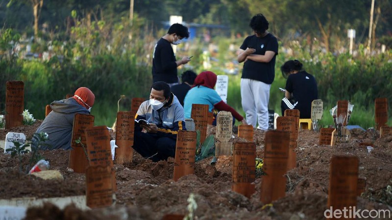 Di area pemakaman khusus COVID-19, sejumlah peziarah tampak fokus mendoakan almarhum anggota keluarga yang dikuburkan di sana.