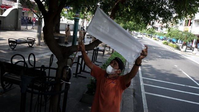 Yogyakarta - Bendera putih menghiasi kawasan Malioboro, Yogyakarta. Bendera itu muncul sebagai simbol PKL yang tengah berkabung akibat terdampak PPKM di masa pandemi.