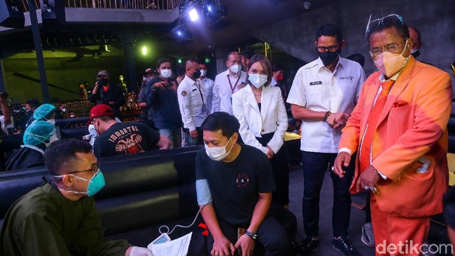 Jakarta - Menteri Pariwisata dan Ekonomi Kreatif Sandiaga Uno hari ini meninjau vaksinasi tahap 2 di bar Holywings, Jakarta.