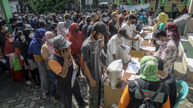 Beginilah penampakan antrean warga yang berdesakan untuk mendapatkan bantuan sosial tambahan berupa 10 kilogram beras di Kelurahan Harapan Jaya, Cibinong, Kabupaten Bogor, Jawa Barat, Kamis (5/8/2021).