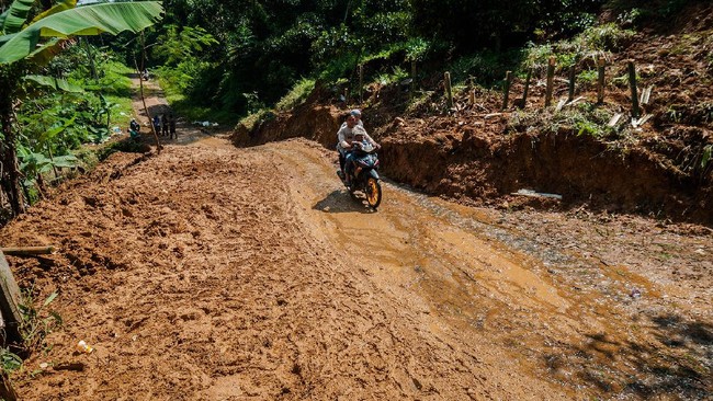 Lebak - Hujan deras mengakibatkan tanah longsor di Desa Banjarsari, Lebak, Banten. Bahkan material longsor juga menutup jalan antar desa.