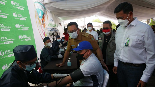 Karawang - Gubernur Jawa Barat Ridwan Kamil meninjau layanan vaksinasi COVID-19 untuk pekerja di Karawang. Kegiatan ini digelar untuk mempercepat terciptanya herd immunity
