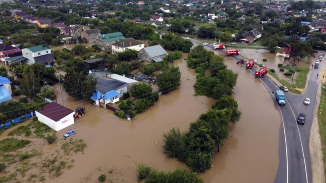Penampakan banjir yang merendam kawasan desa Viniogradny di wilayah Krasnodar, Rusia, Sabtu (14/8/2021) waktu setempat. AP Photo.