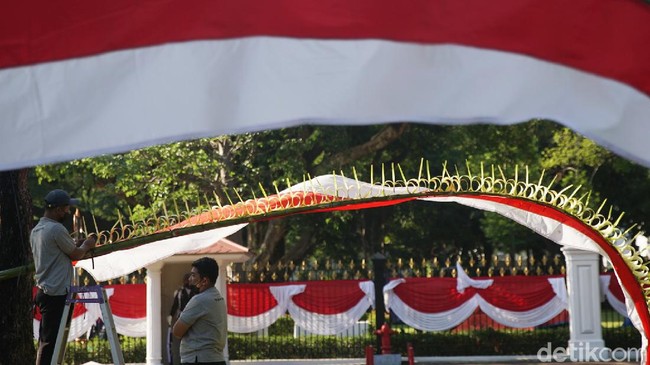 Jakarta - Menjelang upacara peringatan HUT Kemerdekaan RI pada 17 Agustus besok, berbagai persiapan dilakukan di Istana Negara. Ragam dekorasi yang khas mulai dilakukan.