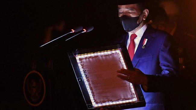 Presiden Joko Widodo (Jokowi) tiba di TMP Kalibata, Selasa (17/8/2021) pukul 00.00 bersama Wakil Presiden Ma'ruf Amin terlebih dahulu melakukan penghormatan di gerbang TMP Kalibata.