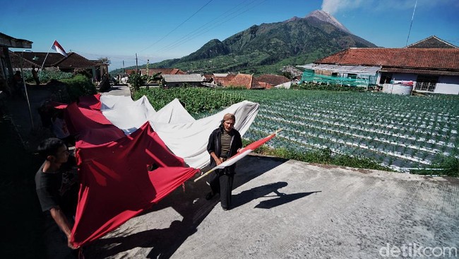 Boyolali - Warga Dukuh Selo Tengah Desa Selo Kecamatan Selo, Boyolali, Jawa Tengah, menggelar pengibaran bendera raksasa di lereng Gunung Merbabu dengan pemandangan Merapi