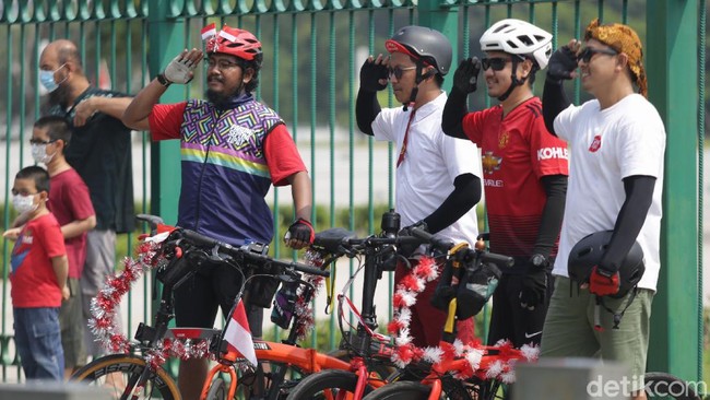Tepat di pukul 10.17 WIB para pesepeda ini antusias mengikuti arahan untuk berhenti sejenak dan hormat saat pengibaran bendera merah putih dalam rangka HUT ke-76 Republik Indonesia.