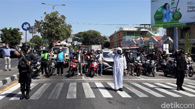 Pemandangan berbeda tampak di simpang 4 Giwangan, Kapanewon Banguntapan, Kabupaten Bantul saat detik-detik proklamasi kemerdekaan Indonesia. Pasalnya kegiatan tersebut melibatkan kendaraan taktis (rantis) milik Satbrimob Polda DIY, Selasa (17/8/2021).
