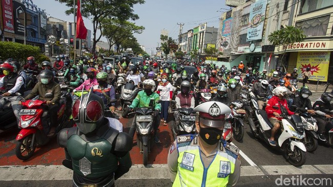 Sejumlah pengendara berhenti sejenak di Jalan Margonda, Depok, Selasa (17/8/2021). Ada Satria Baja Hitam dan pak Polisi juga loh.