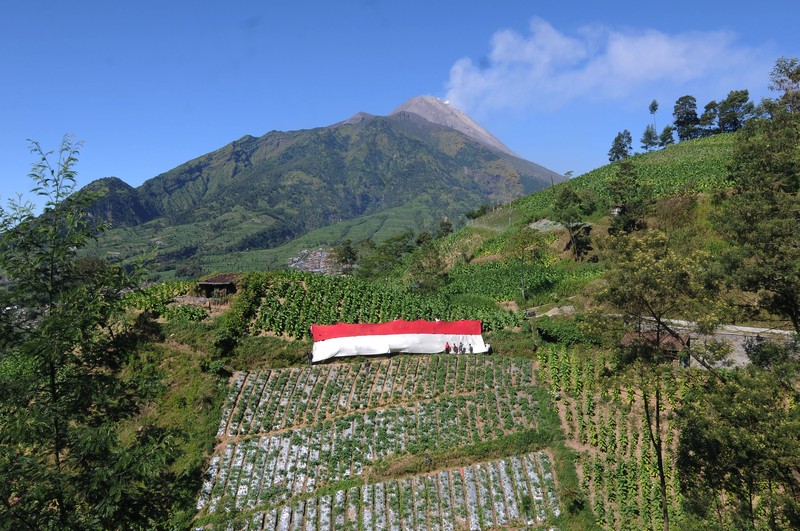 Warga mengkirab bendera perah putih yang akan dibentangkan di lahan pertanian kaki Gunung Merbabu, Selo Tengah, Selo, Boyolali, Jawa Tengah.