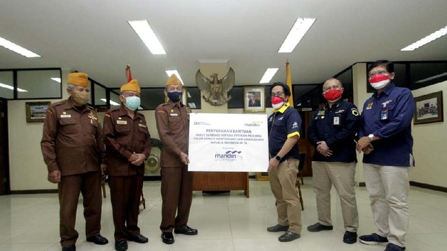 (Ki-ka) Kabiro Penyelenggara Jiwa, Semangat dan Nilai-nilai Juang'45 (JSN 45) Legiun Veteran Republika Indonesia (LVRI) DKI Jakarta Idris Lamani, Bendahara LVRI DKI Jakarta Kol (Purn) Bustam Chaidir, Ketua DPD LVRI DKI Jakarta Marsda TNI (Purn) Sri Budjono, VP CSR Dept Head Bank Mandiri Diwangkoro Ratam, BSH Region III/Jakarta 1 Bank Mandiri Dody Baskoro, dan BSH Region IV/Jakarta 2 Bank Mandiri Mahatma Putra Jaya saat penyerahan apresiasi berupa paket sembako di Kantor DPD LVRI Jakarta.