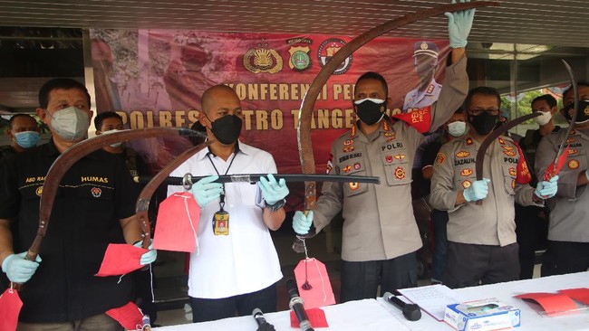 Tangerang - Tawuran remaja terjadi saat PPKM di kawasan Karawaci, Tangerang, Banten. Barang bukti celurit hingga samurai diamankan.