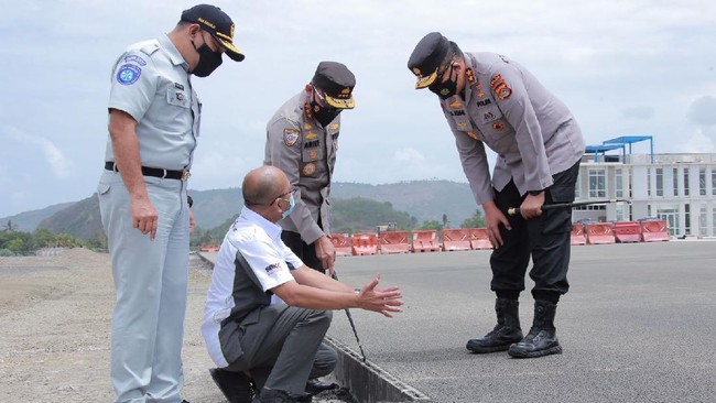 Lombok - Kabarhakam Polri bersama Kapolda NTB dan ITDC serta Dirut Jasa Raharja menyambangi Sirkuit Mandalika. Mereka mengecek ketebalan dan kualitas aspal.