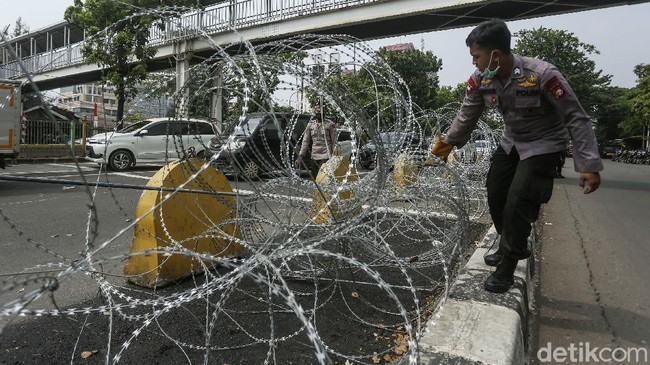 Polisi yang berjaga di Pengadilan Tinggi (PT) DKI mulai membuka kawat duri yang membatasi akses masuk jalur lambat di depan PT DKI.