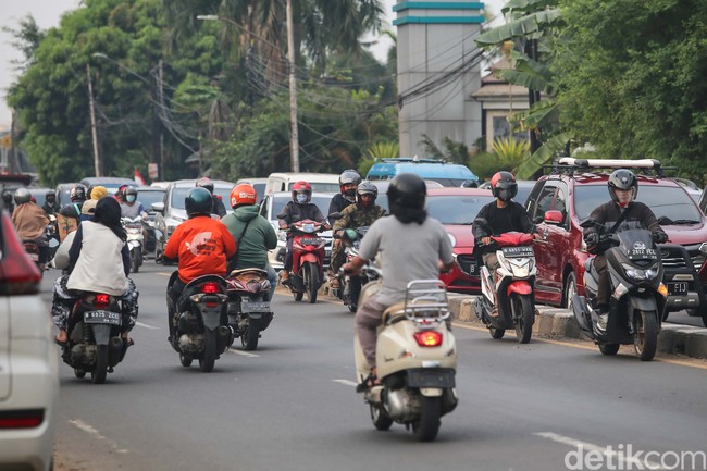 Depok - Meski berbahaya, para pengguna sepeda motor berkendara melawan arah di Cinangka, Jalan Raya Parung, Depok, Jawa Barat, Sabtu (4/9/2021).