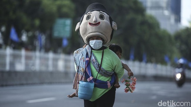 Jakarta - Dibalut kostum karakter, Asih (33) bersama buah hatinya Delisah (3) berjalan kaki mengharap belas kasih dari pengguna jalan di Ibu Kota.