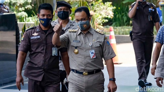 Jakarta - Anies Baswedan memenuhi panggilan KPK sebagai saksi di kasus dugaan pengadaan lahan di Munjul, Jaktim. Anies sempat mengacungkan jempolnya saat tiba di KPK.