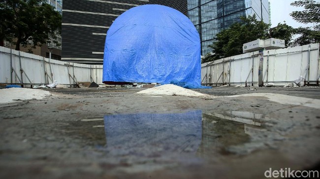 Jakarta - Sempat ramai pada April lalu, pembangunan tugu sepeda di kawasan Sudirman yang kini mangkrak. Tak ada satupun pekerja yang menyelesaikan tugu sepeda tersebut.