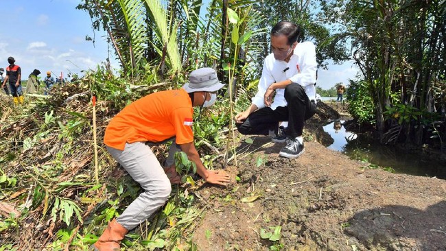 Cilacap - Presiden Jokowi hari ini melakukan sejumlah kunjungan di Kabupaten Cilacap, Jawa Tengah. Salah satunya melakukan penanaman mangrove di Desa Tritih Lor
