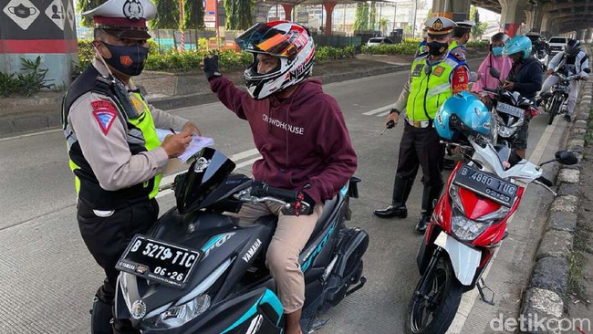 Jakarta - Sejumlah pemotor ditilang petugas kepolisian di Jalan DI Panjaitan, Jakarta Timur, Minggu (3/10). Mereka kedapatan melintas di jalur cepat.