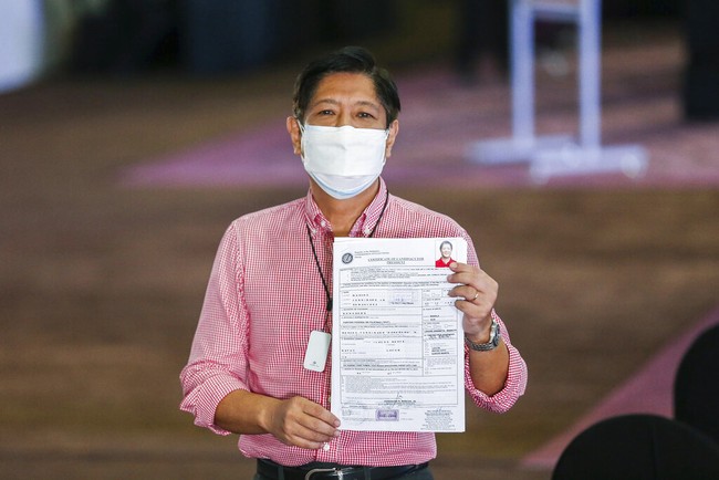 Manila - Ferdinand Marcos Jr menunjukan formulir pendaftaran pilpres Filipina di Manila, Rabu (6/10). Ia merupakan putra dari mantan diktator Filipina, Ferdinand Marcos